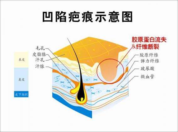 轻度凹陷性疤痕:疤痕自身的萎缩导致表面凹陷,如痤疮、水痘、天花的后遗症,多数呈豆状,凹陷较浅,无功能性障碍。此种程度的凹陷疤痕,多采用激活肌底细胞再生,自主填充凹陷的方法治疗。